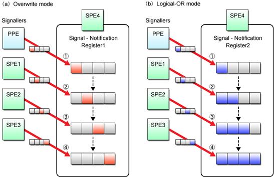 Each bit of the 32-bit signal data can be assigned to the program's own specific meaning. By doing so, the signal can notify the SPE of anything from the change of status to the completion of processing. The SNRs can also be configured for overwrite mode or logical OR mode. The overwrite mode is useful in a one-to-one signaling environment, whereas the logical OR mode enables many-to-one signaling. Either of these modes can be selected for each SNR, independently of the other.