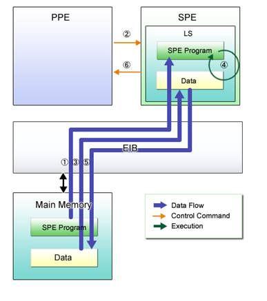 In line with the Cell architecture, let’s take a look at how PPE and SPE programs are executed, together with how necessary data is transmitted and received.